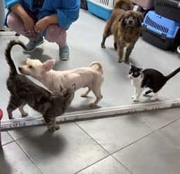 Sie nahm ihn mit und beim Tierarzt musste zuerst einmal das komplette Fell samt der Filzplatten geschoren werden.